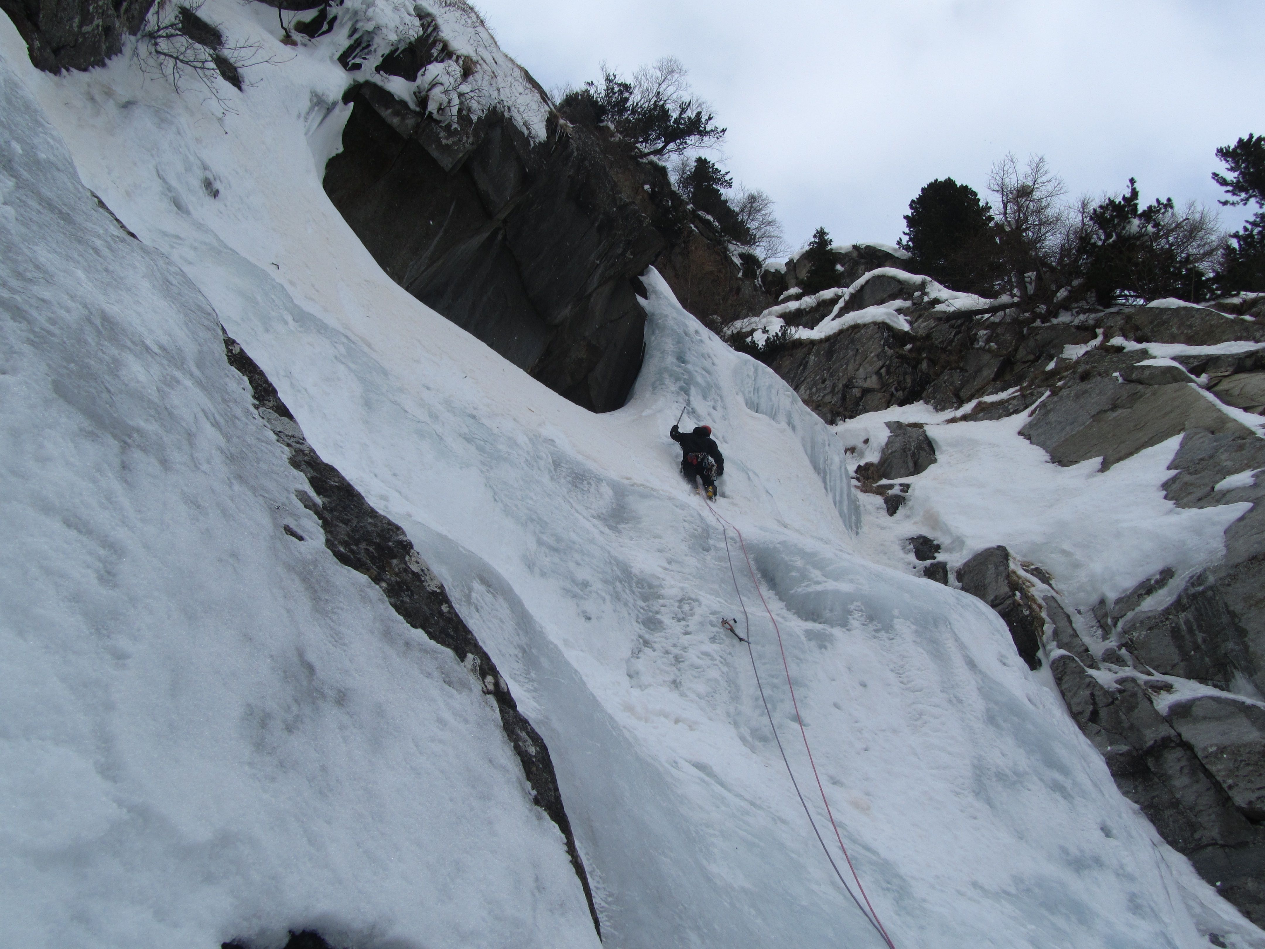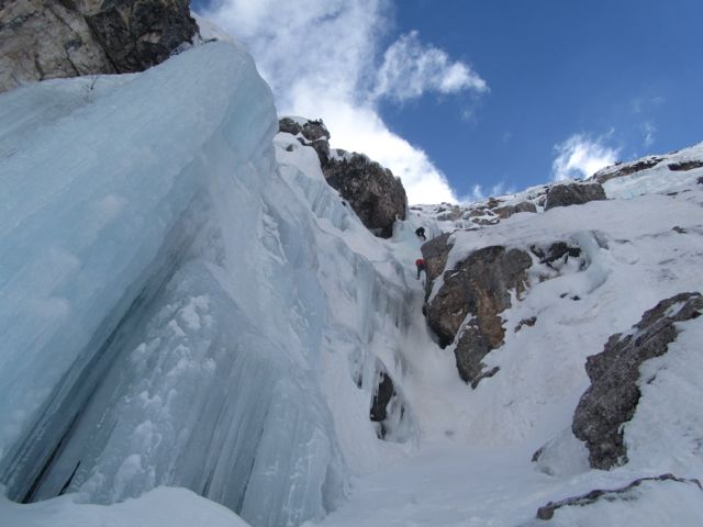 Met de steun van Nelson, Olivier en Eivind trek ik met de halve groep naar Travenanzes. Quinten, Nicolas, Kristof en Niels trekken naar het Arntal om daar een mooie vierdegraads van ruim 250m te klimmen. In Val Travenanzes verdelen we ons over vier niet al te slecht gevormde watervallen. Denis en Friedemann beklimmen Topazio, 180m III 4, Olivier gaat met Jeroen door een lijn links op Sogno Canadese, 200m III 5 en Nelson, Eivind en Sebastiaan beklimmen de rechterkant van Sogno Canadese. An en ik klimmen tussen deze twee watervallen een lijn op Diamante 175m, III 4+. Uiteindelijk slaagt niemand er in om het bovenste deel van onze watervallen uit te klimmen, een onstabiele croûte van sneeuw maakt het klimmen daar te gevaarlijk. Maar we klimmen allemaal de mooiste lengtes over enkele goed gevormde pilaren.