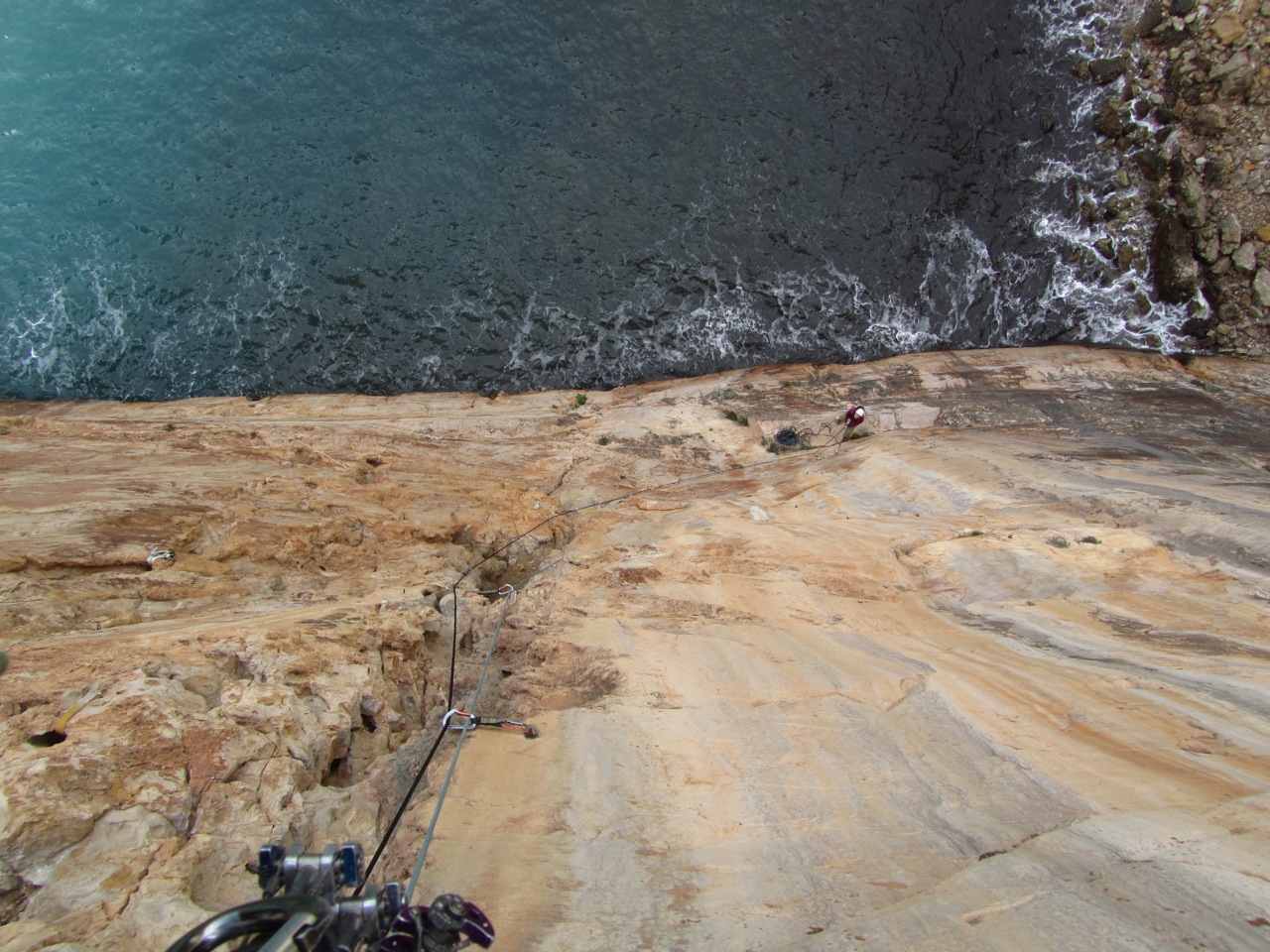 We kiezen voor “El Dorado”, 150m E1 6a+. De afzekering in de eerste lengte is ronduit belachelijk slecht, volledig gecorrodeerd of gewoonweg onbestaande. An is al helemaal niet dol op tegen de rotsen slaande golven en we zijn allebei blij dat we wat hogerop de wand betere omstandigheden treffen. De laatste twee touwlengtes zijn wonderbaarlijk mooi. Na deze korte route hebben we nog tijd over en we trekken naar Toix TV, waar wondermooi klimmen op Kalymnos-achtige tufa’s onze namiddag in de zon vult. We klimmen er nog “Monkey Wall”, 6c en “Painted Wall”, 6b+.